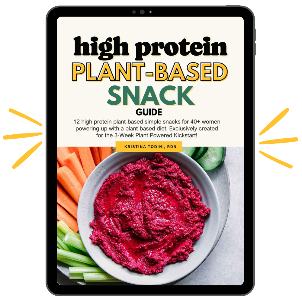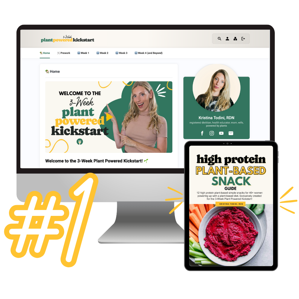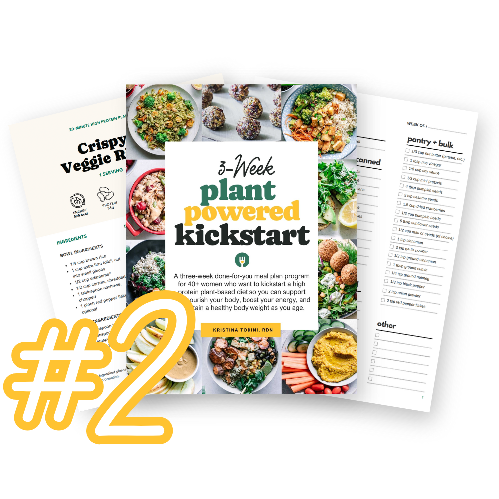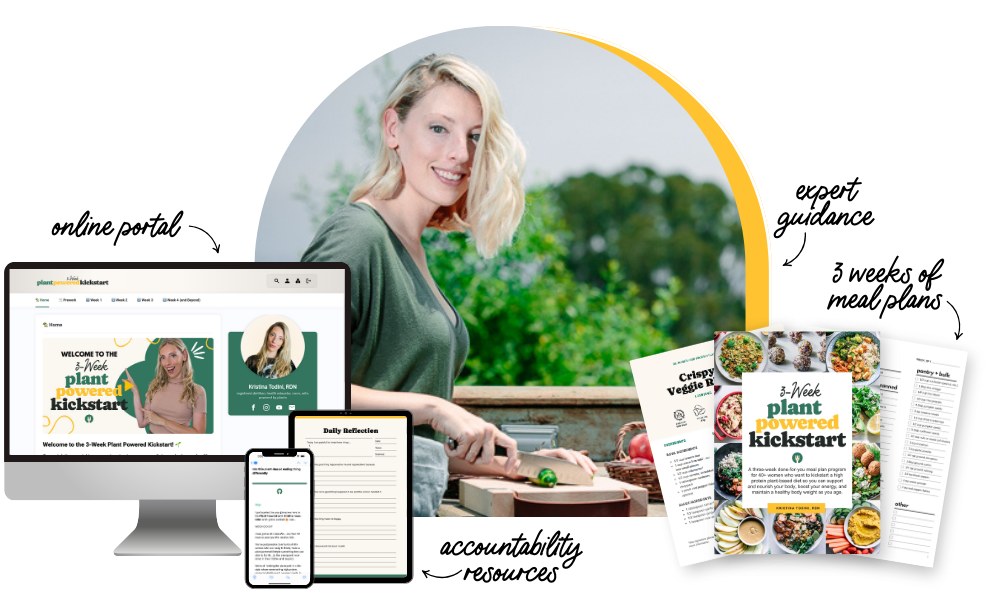 The 3-Week Plant Powered Kickstart is a three-week done-for-you meal plan program for women like you in their 40s, 50s, 60s, and beyond who want to kickstart a high protein plant-based diet so you can support and nourish your body, boost your energy, and maintain a healthy body weight as you age.