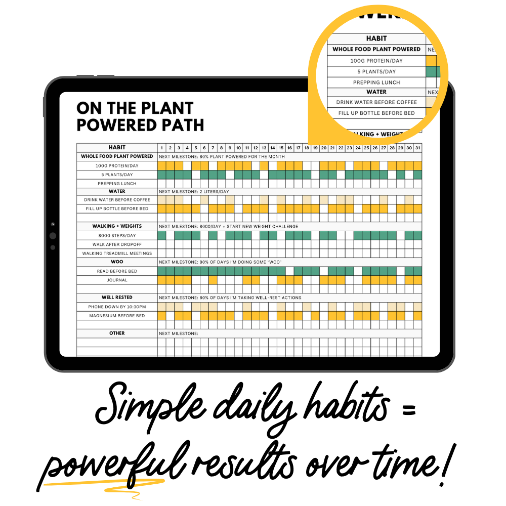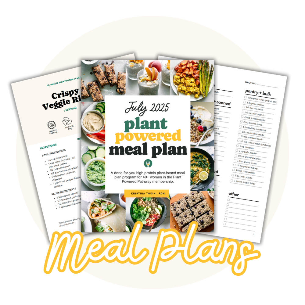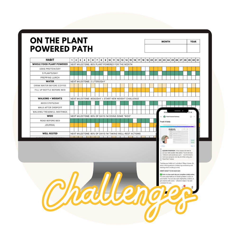 The Plant Powered Pathway is a monthly membership for women 40+ who want to turn their plant-powered momentum into a sustainable lifestyle—with fresh recipes and meal plans, a simple daily habit-building framework, and a community walking the path with you.
