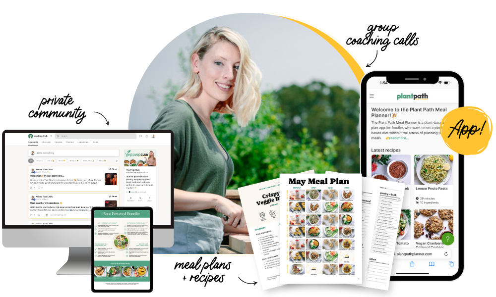 You’ll get access to the Plant Path Planner, a web-based app you can use on your phone or computer. This is where new recipes are released weekly, and where you can build custom meal plans using Kristina’s full recipe library.